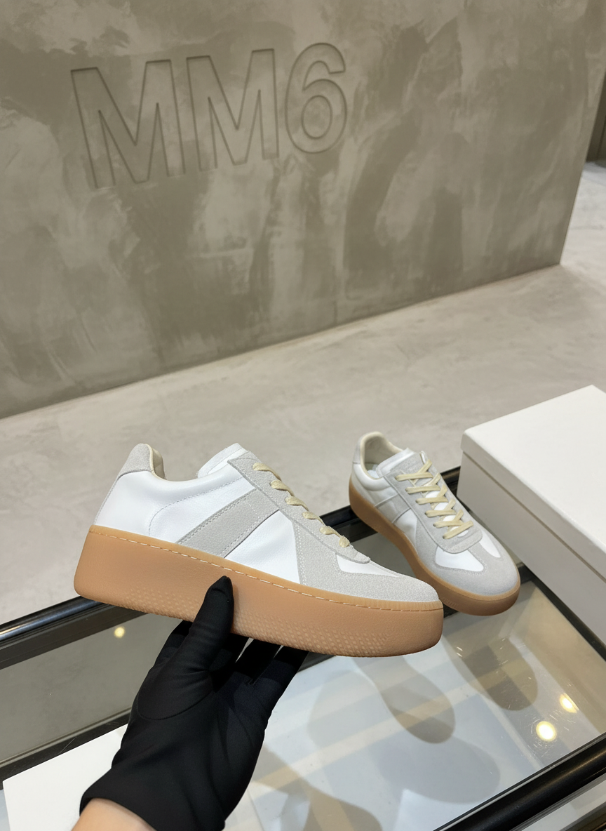 Maison Margiela leather and suede sneakers with gum sole, classic white and beige design, perfect for casual wear and luxury street style.