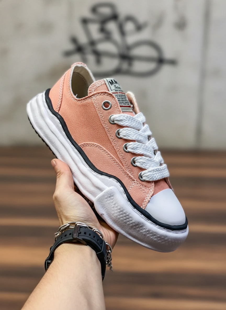 Maison Mihara Yasuhiro Pink Canvas Low Top Sneakers, Unique Wavy Sole Design, Lace-Up, Sizes 36-44, Stylish Casual Shoes for Men and Women.