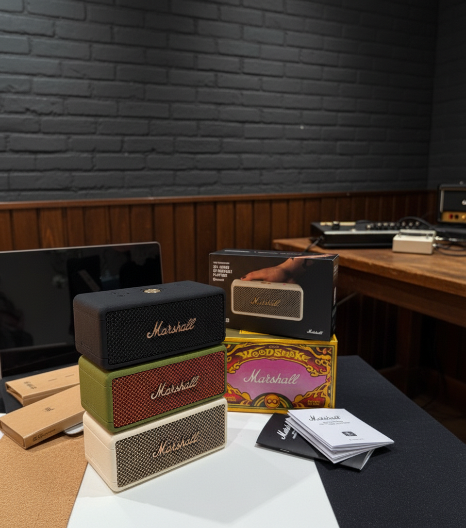 Marshall portable Bluetooth speaker with up to 20 hours of playtime, powerful sound, and stylish design, perfect for music lovers on the go.