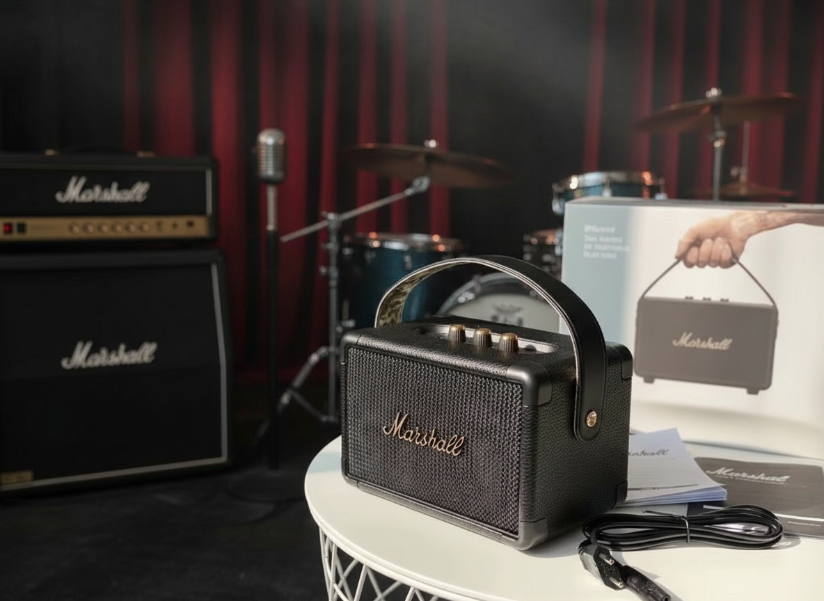 Marshall portable Bluetooth speaker with premium sound, classic design, leather strap, long battery life, perfect for home, travel, and outdoor music lovers.