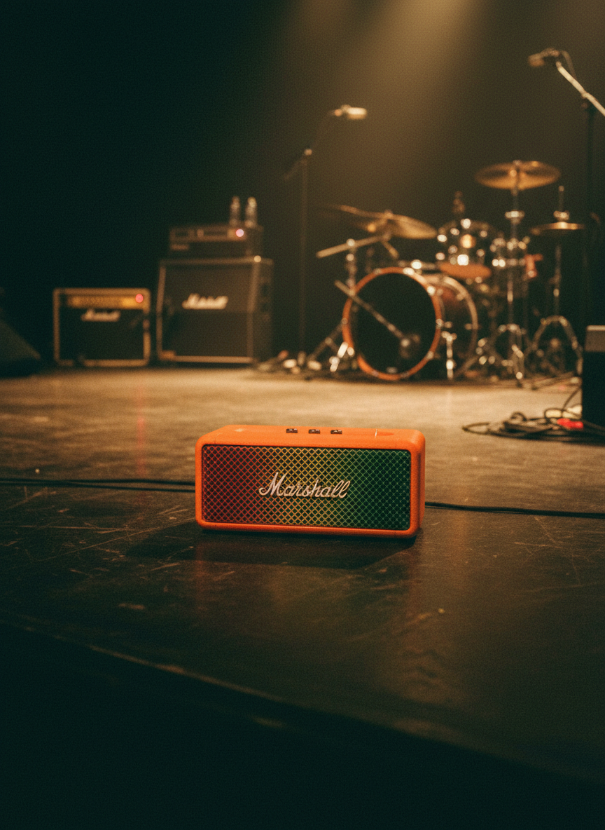 Marshall Portable Bluetooth Speaker with vibrant multicolor grill, delivering powerful sound, deep bass, and long battery life for indoor and outdoor music enjoyment.