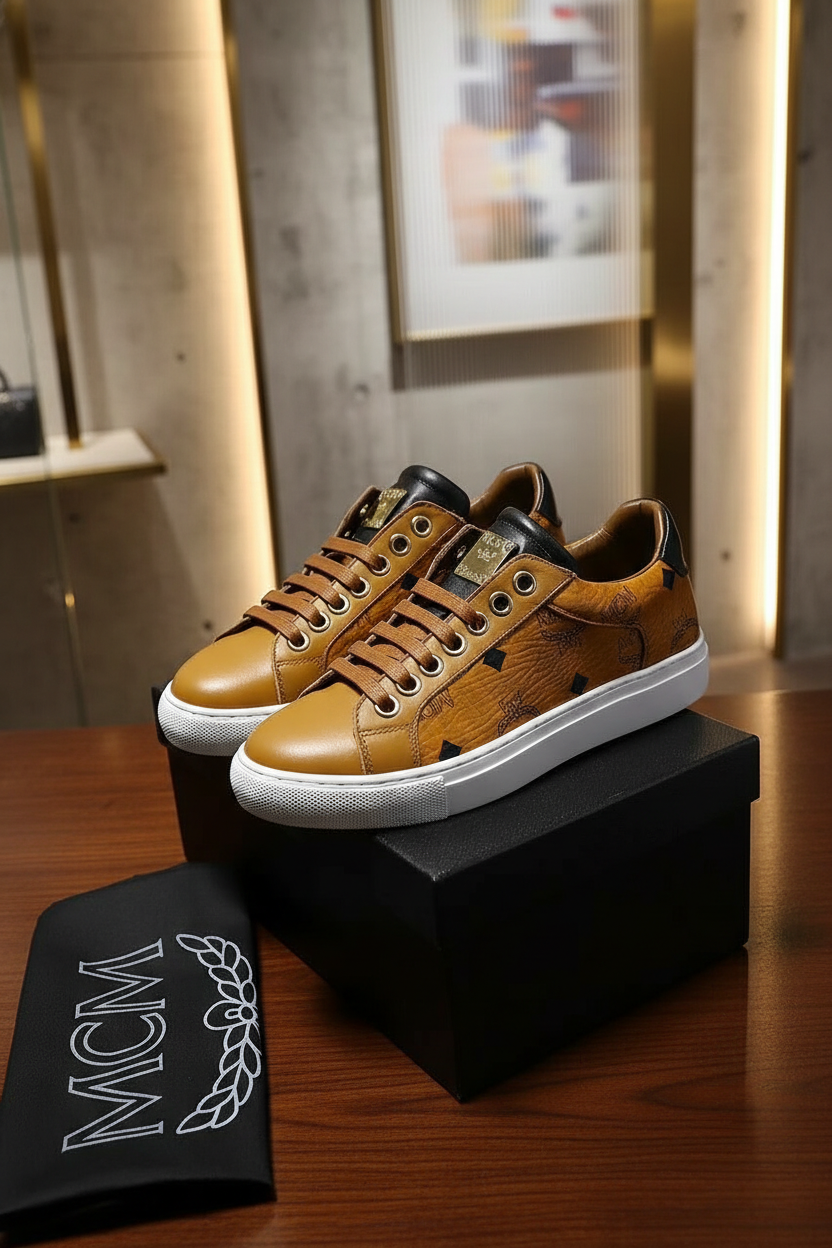 MCM Luxury Leather Sneakers for Men, Classic Cognac Brown Designer Casual Shoes with Logo Print, Comfortable Lace-Up Style, Perfect for Street Fashion and Everyday Wear