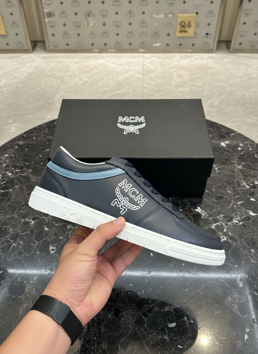 MCM Men’s Luxury Leather Sneakers, navy blue casual shoes with white sole, premium craftsmanship and iconic logo design for stylish comfort and everyday wear.