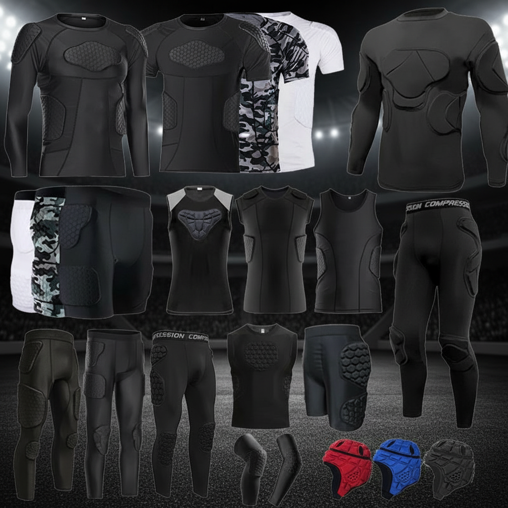 Brand ProShield padded sports compression shirts, shorts, pants & helmets for football, basketball, skating, skiing, offering impact protection & comfort for training & competition.