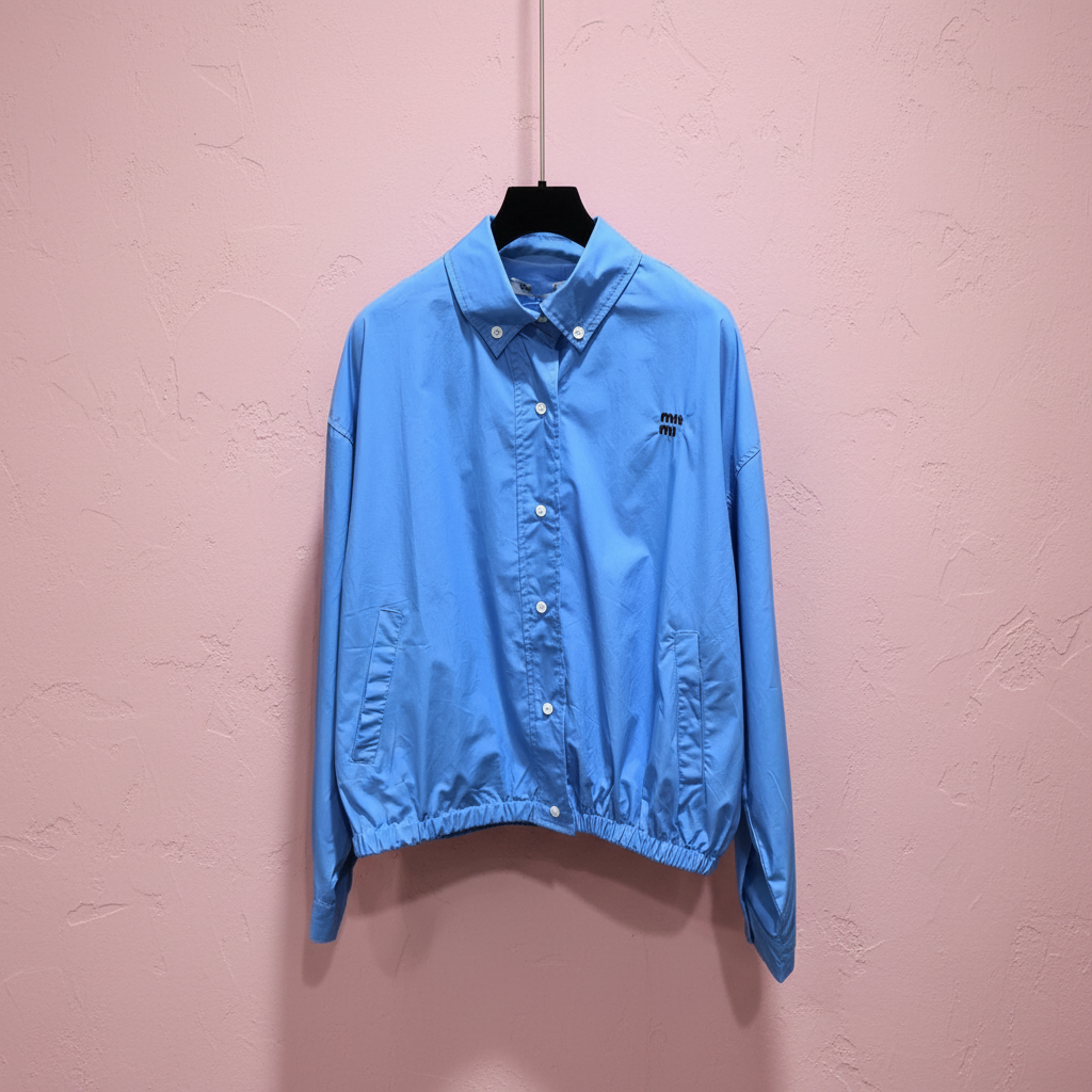 Miu Miu Blue Button-Up Jacket, Lightweight Casual Outerwear with Elastic Hem and Side Pockets, Stylish Spring Fashion for Women.