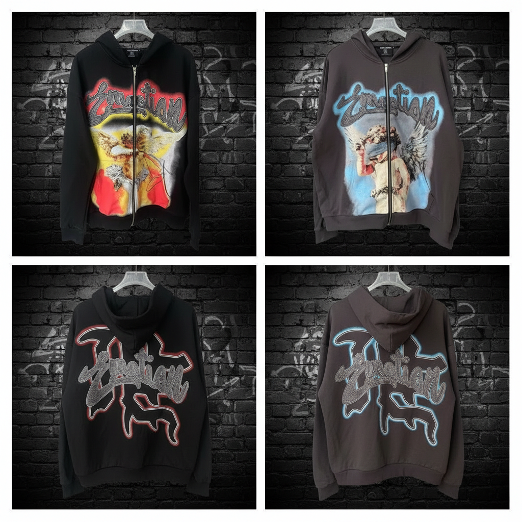 Mixed Emotion hoodies feature bold angel and abstract prints, zip-up front, and streetwear style, perfect for casual wear and fashion lovers seeking unique urban designs.