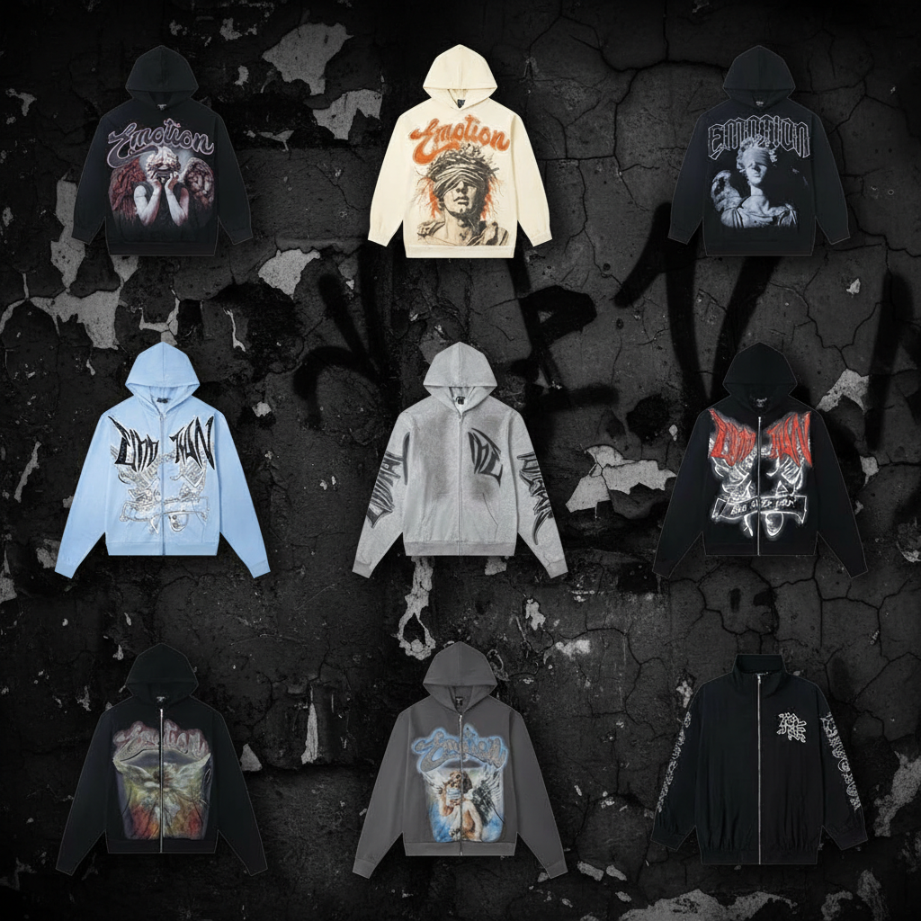 Mixed Emotion hoodies, streetwear zip-up and pullover designs, graphic prints, casual fashion for men and women, comfortable fit for everyday wear and outdoor style.