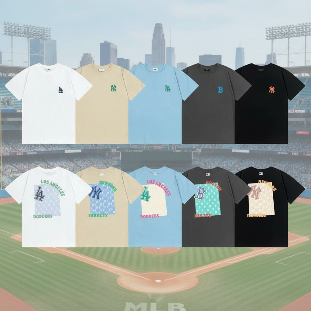 MLB T-Shirts featuring Dodgers, Yankees, Red Sox, and Twins logos, stylish casual wear for baseball fans, premium cotton, perfect for sports and everyday outfits.