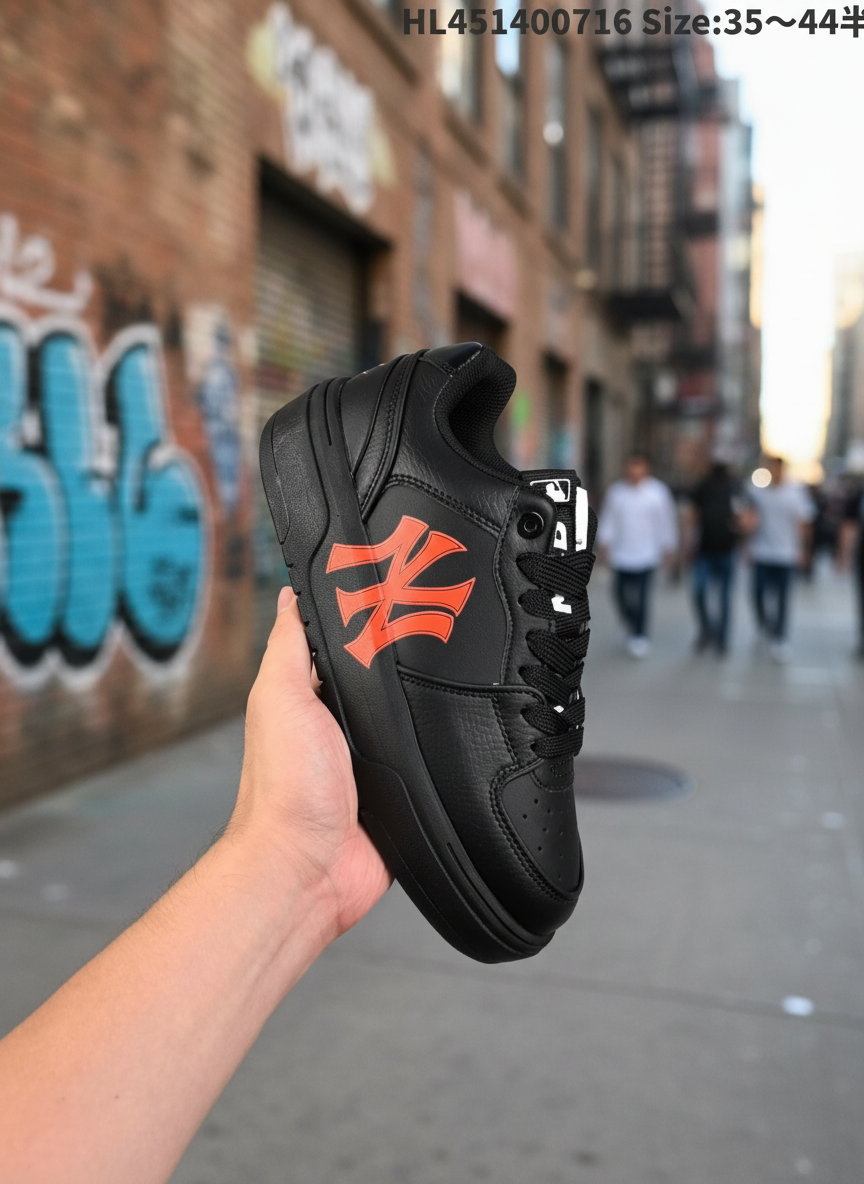 MLB Black Leather Sneakers with Bold Red Logo, Casual Sport Shoes for Men and Women, Sizes 35-44.5, Comfortable and Stylish for Everyday Wear.