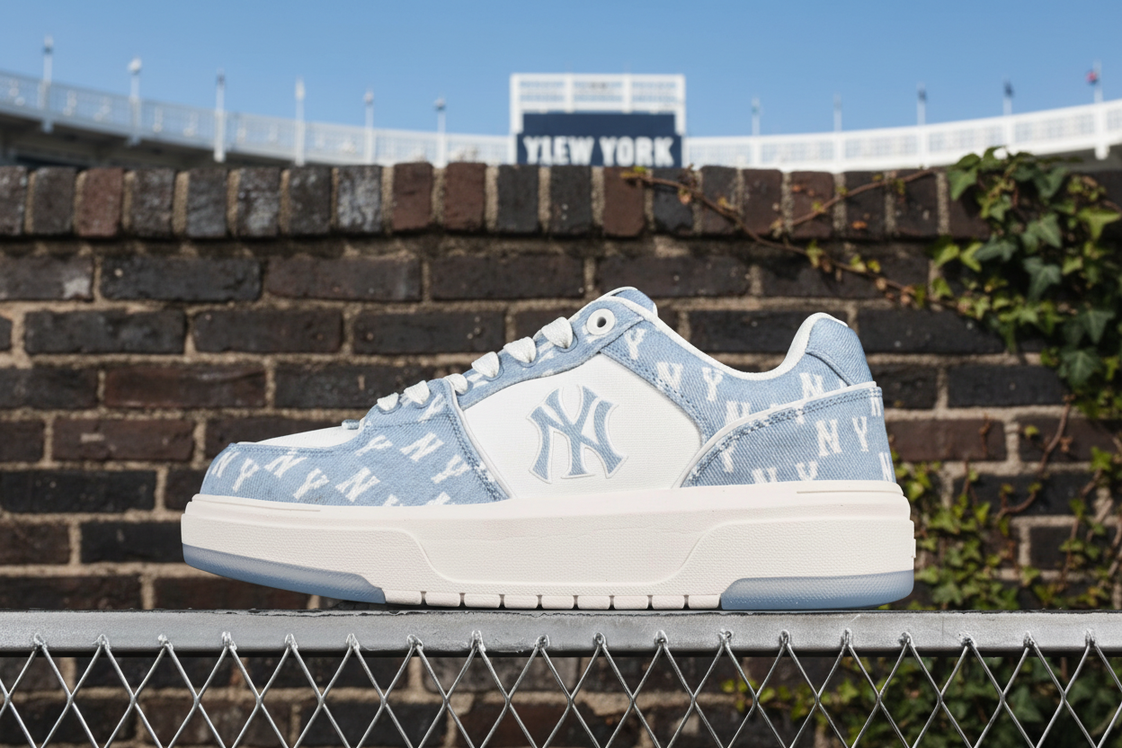 MLB New York Yankees Denim Sneakers, stylish blue and white casual shoes with iconic NY logo, perfect for streetwear and everyday comfort.