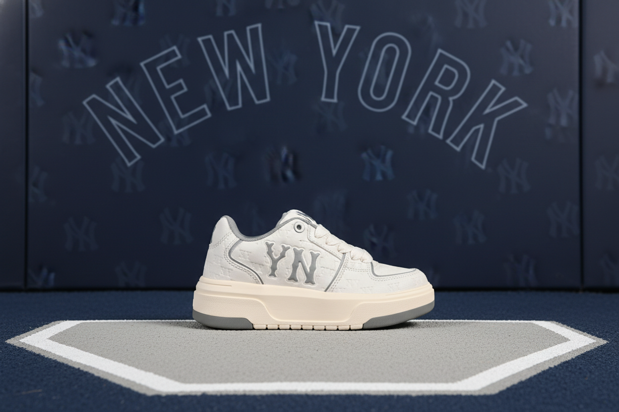MLB NY sneakers with embossed logo, stylish white leather upper, chunky sole design, perfect for casual wear and street fashion.
