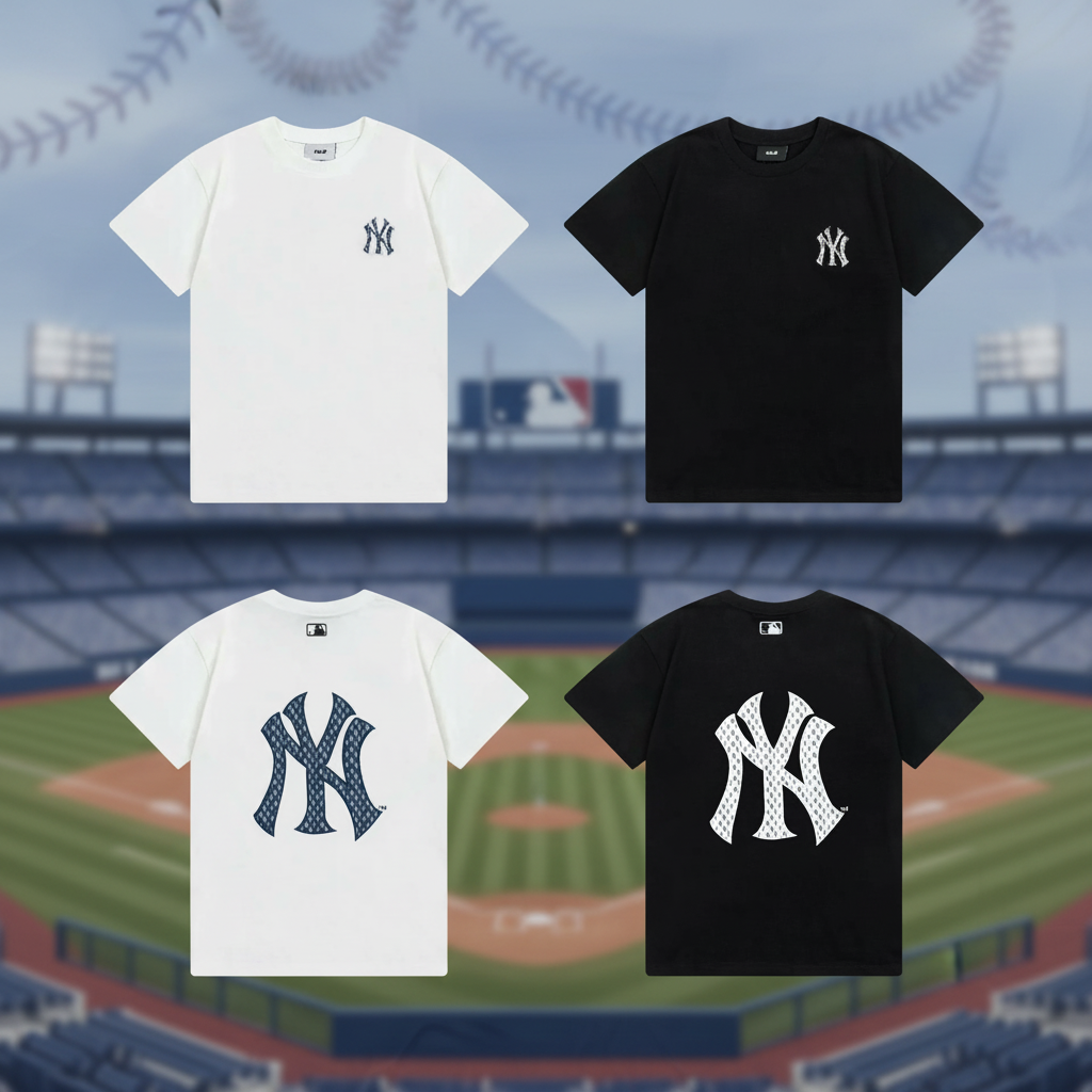 MLB New York Yankees cotton T-shirt, classic logo print on front and back, casual sports style, available in black or white, perfect for fans and streetwear fashion.