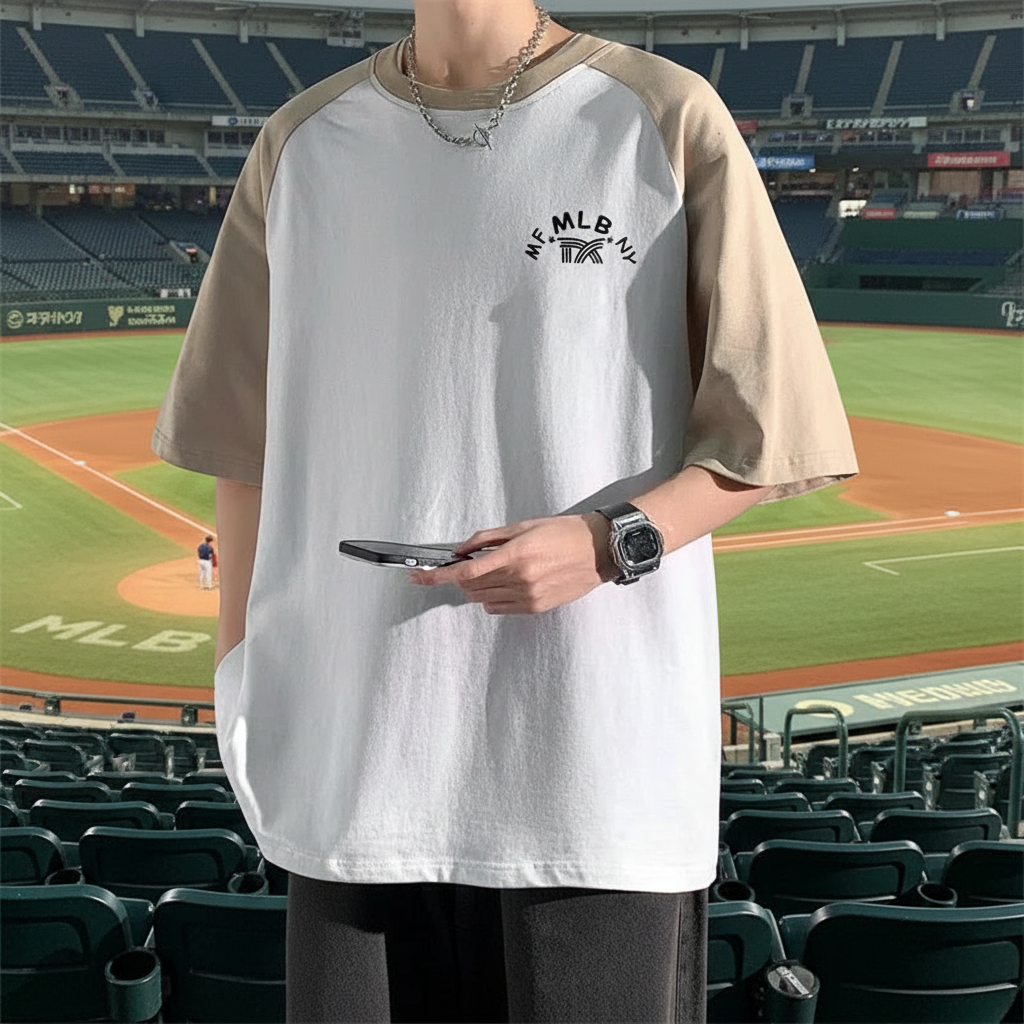 MLB casual color-block raglan sleeve T-shirt, soft cotton fabric, trendy oversized fit for everyday streetwear style.