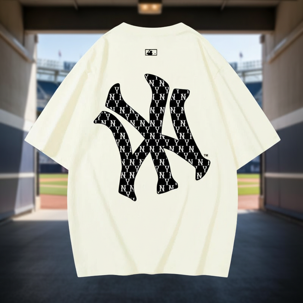 MLB New York Yankees oversized cream T-shirt with bold monogram logo print, casual streetwear style, comfortable cotton for daily wear.