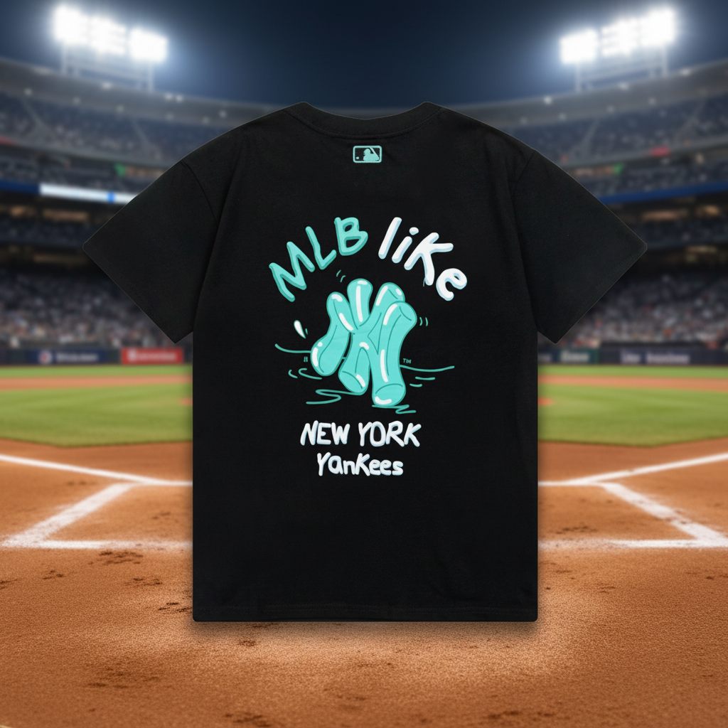 MLB New York Yankees black graphic T-shirt with playful aqua logo design, casual streetwear style, breathable cotton for everyday comfort.