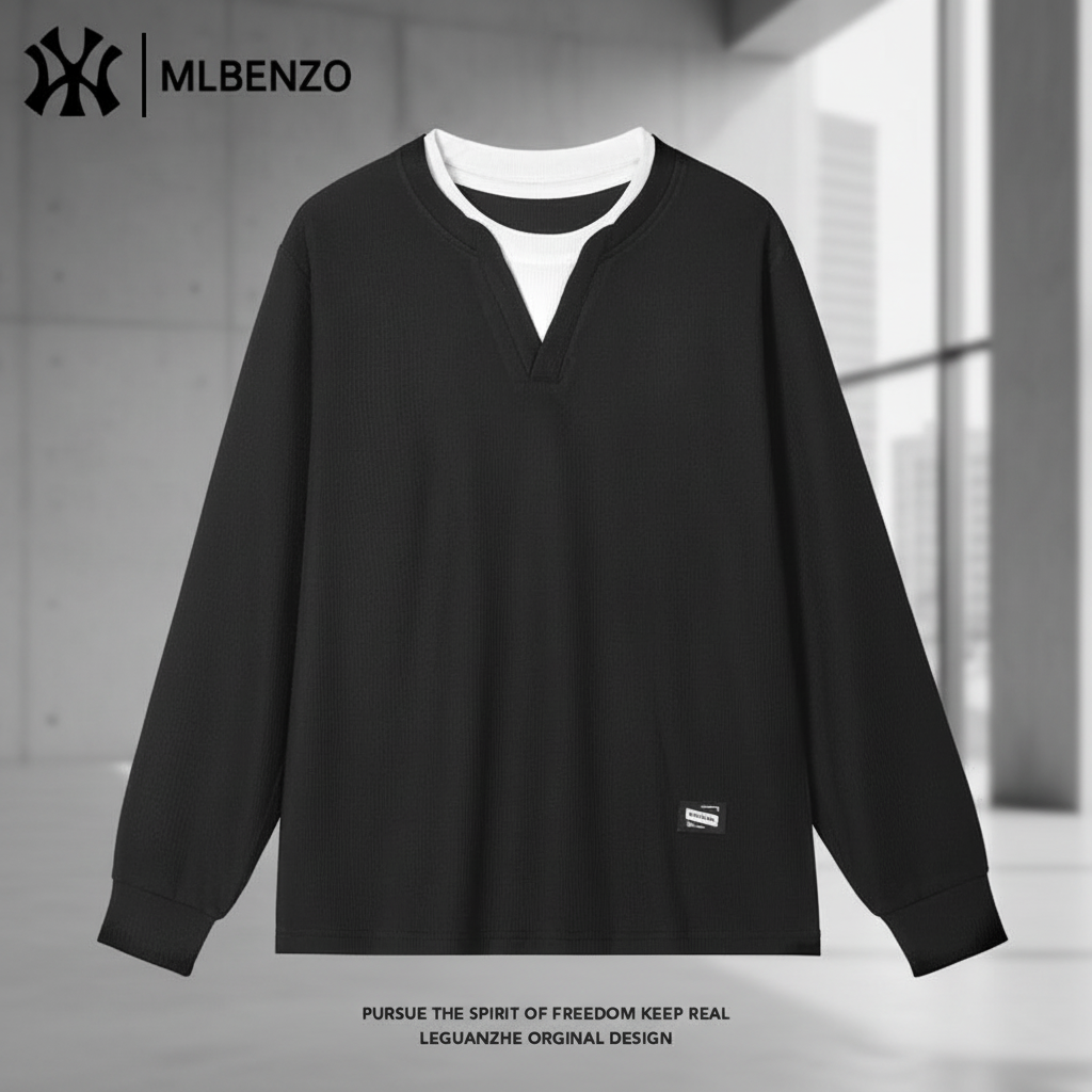 MLBENZO Black Long Sleeve T-Shirt, casual loose fit with layered neckline design, stylish and comfortable for everyday wear.