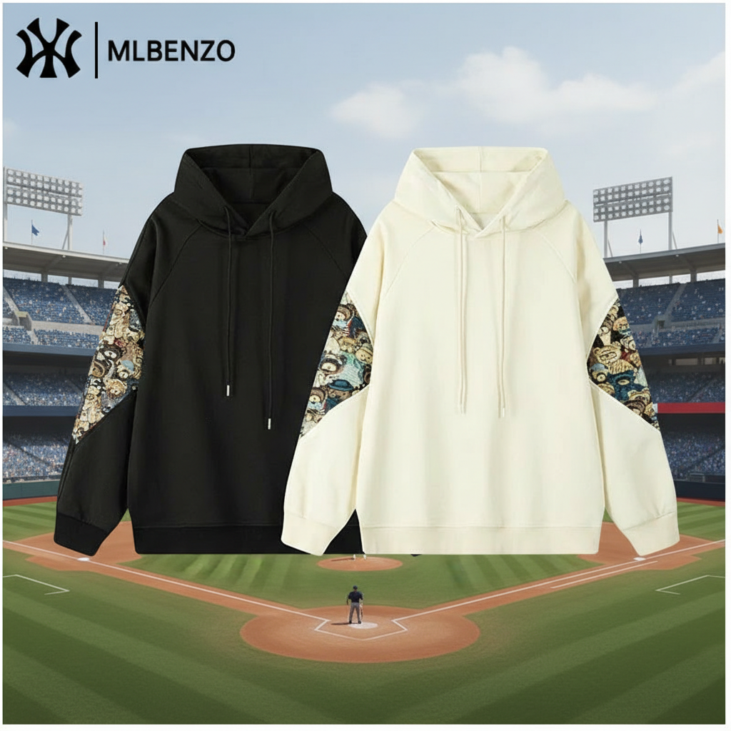 MLBENZO Hoodies with unique printed sleeve panels, soft cotton blend, casual oversize fit, perfect for streetwear, autumn and winter fashion.