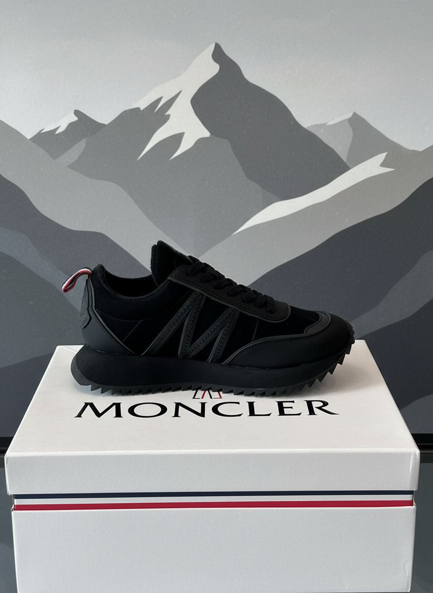 Moncler black designer sneakers, stylish low-top men’s shoes with rugged sole, premium comfort, perfect for casual and urban fashion wear.
