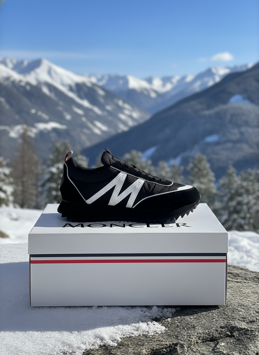 Moncler men’s black and white fashion sneakers, lightweight design with durable sole, perfect for casual wear and street style.