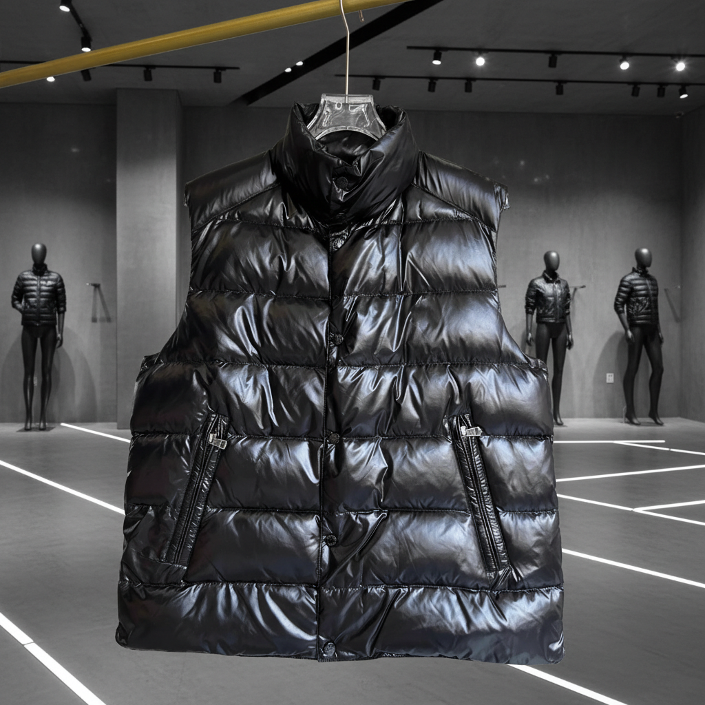 Moncler Black Puffer Vest, lightweight sleeveless down jacket with high collar, zip pockets, and glossy finish, perfect for winter layering and outdoor style.