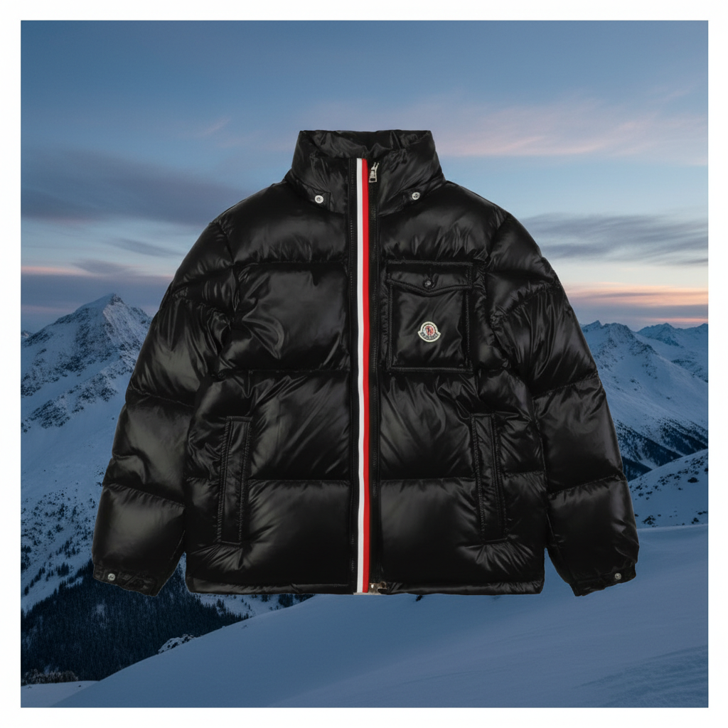 Moncler MK Logo Pocket Black Down Jacket with Tricolor Trim Size: 1 2 3 4 5 6