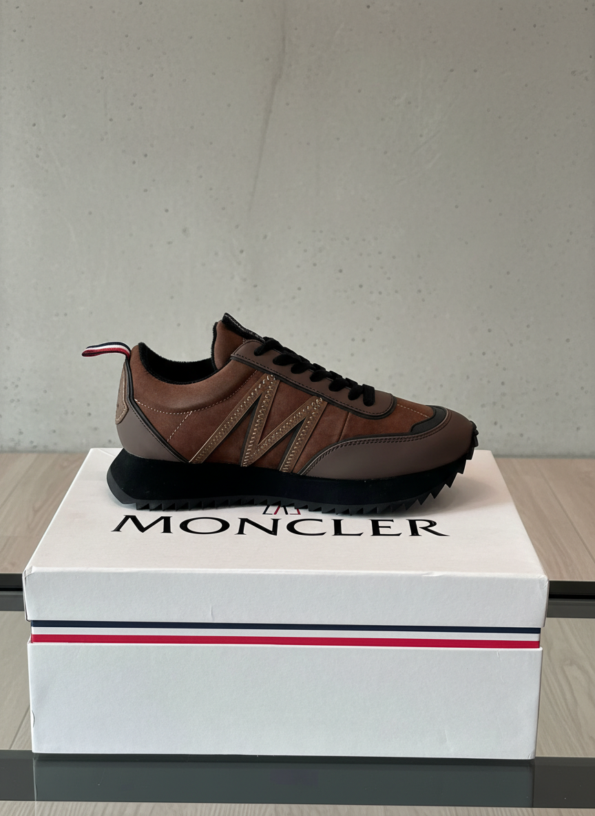 Moncler men’s brown leather sneakers with black laces, lightweight design and durable sole, perfect for casual wear and outdoor activities.