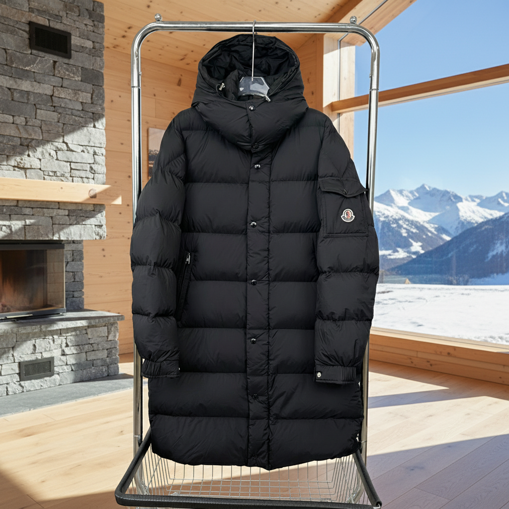 Moncler black long down jacket with hood, premium winter coat offering exceptional warmth, lightweight comfort, and timeless style for cold weather adventures.