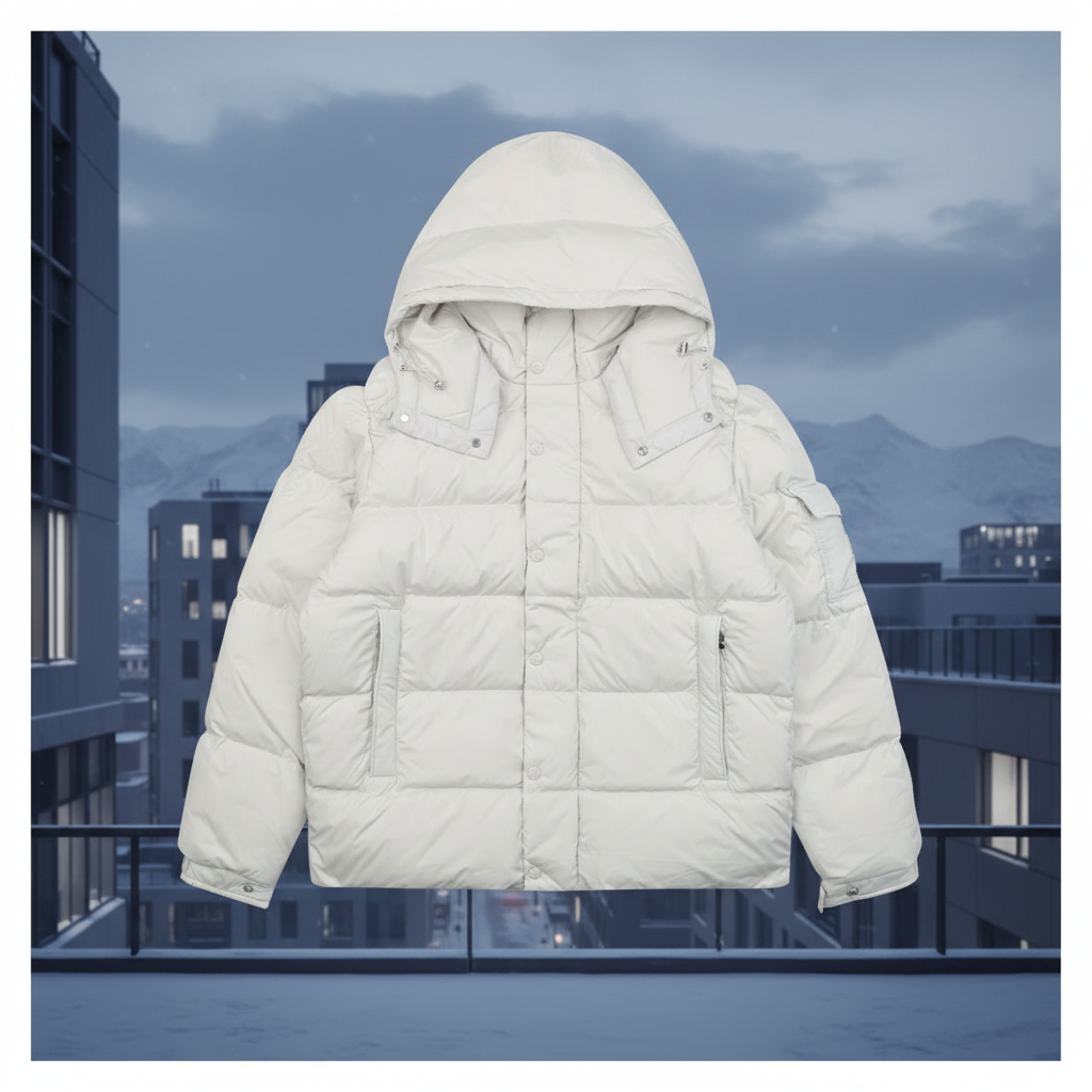 Moncler Maya70 Fog White Hooded Down Jacket, warm and stylish winter coat with premium insulation, available in sizes 1 2 3 4 5 6.