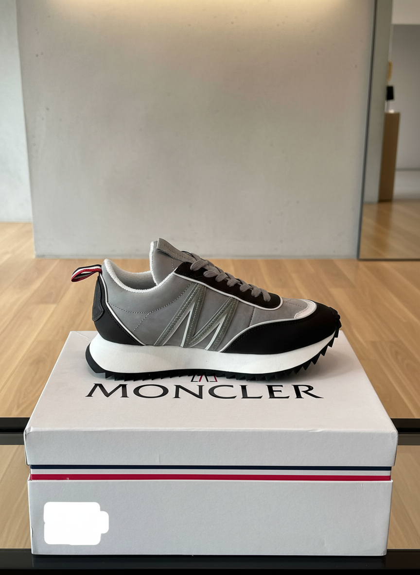 Moncler men’s retro running sneakers in grey and black, featuring premium suede and mesh upper, cushioned sole, and signature stripe heel tab for stylish comfort.