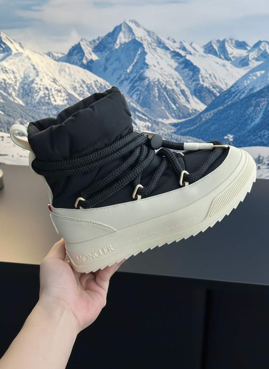 Moncler winter snow boots with black upper, beige sole, and rope laces, offering stylish warmth, comfort, and durability for outdoor adventures.
