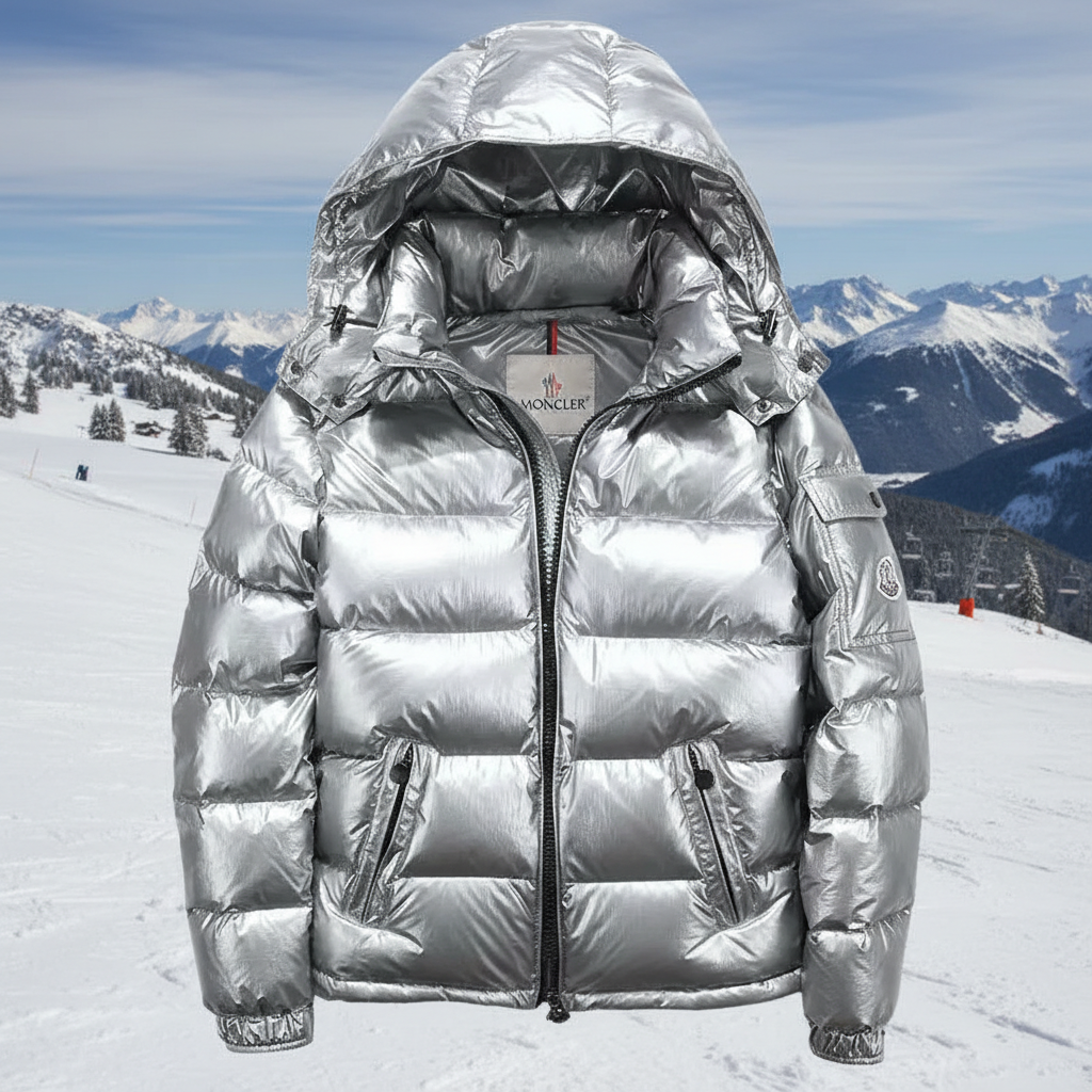 Moncler Silver Hooded Down Jacket, ultra-light, warm, and stylish for winter outdoor activities, featuring glossy finish and premium insulation.