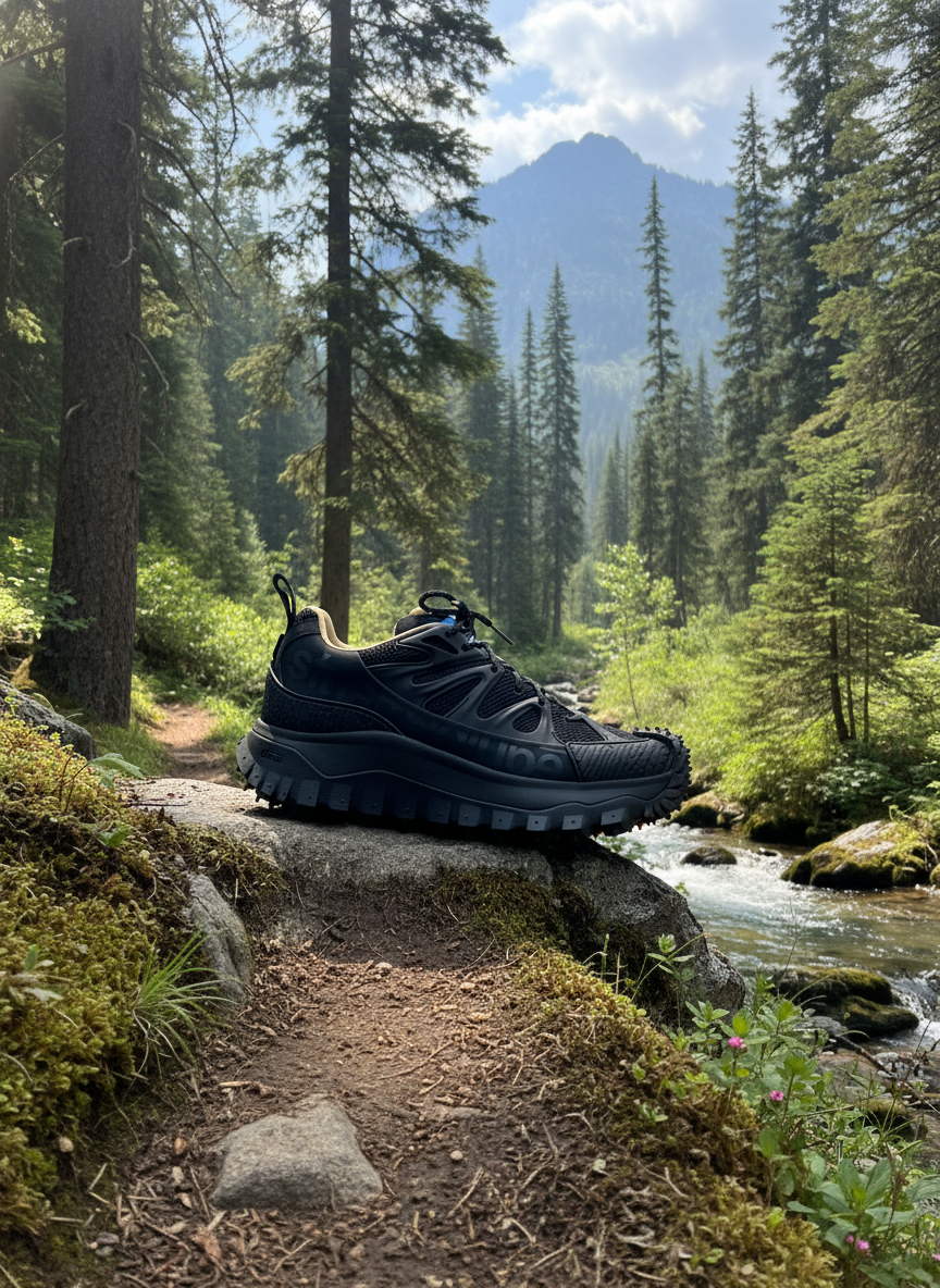 Moncler men’s black trail sneakers with rugged Vibram sole, breathable mesh panels, and modern design for outdoor performance and urban style.