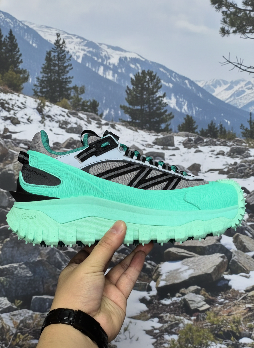 Moncler men’s mint green trail sneakers with Vibram sole, breathable mesh upper, and durable design for outdoor running and casual wear.