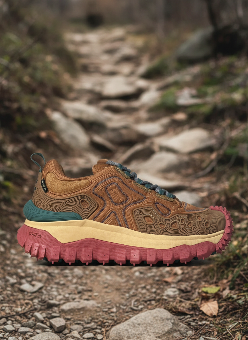 Moncler men’s outdoor sneakers with vibrant sole, durable patterned upper, and all-terrain grip for stylish comfort and performance.