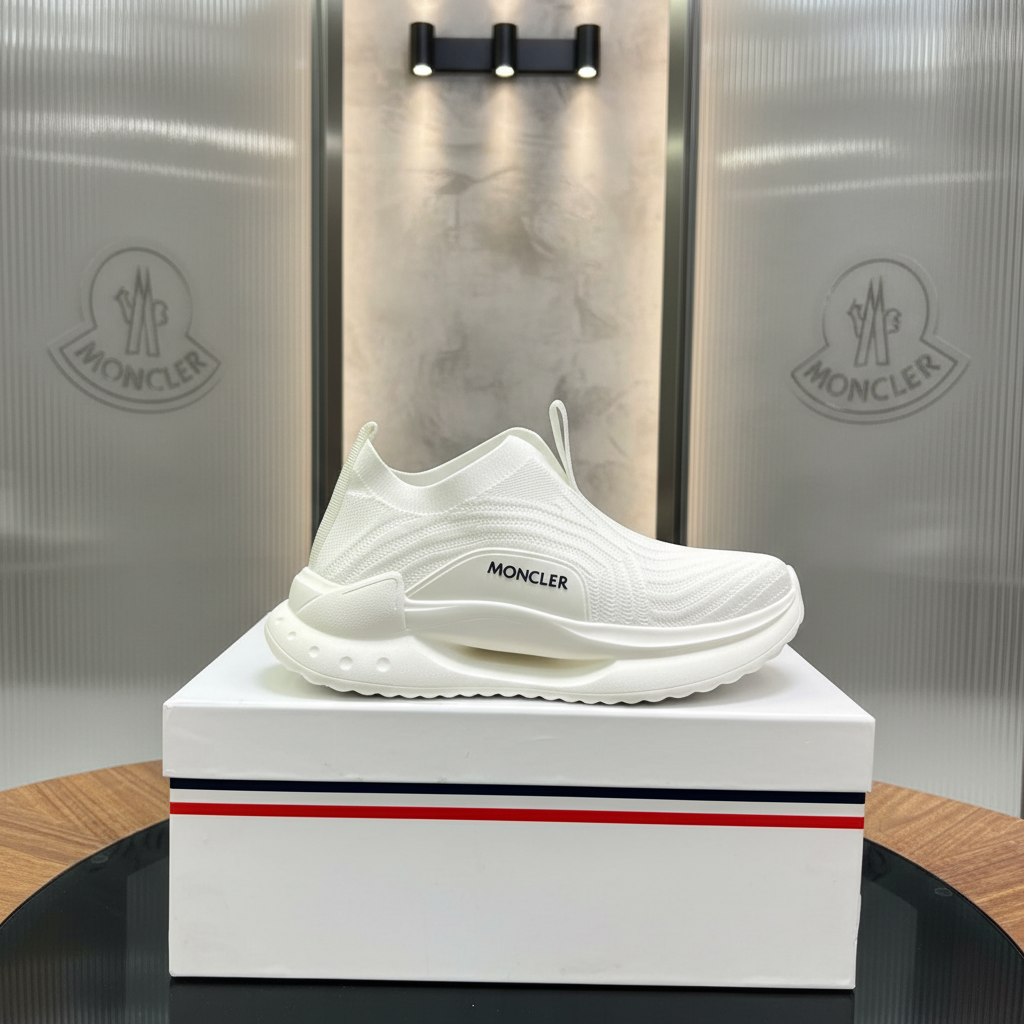Moncler White Knit Slip-On Sneakers, lightweight breathable design, cushioned sole for comfort, perfect for casual wear and sports, stylish luxury footwear for men and women.