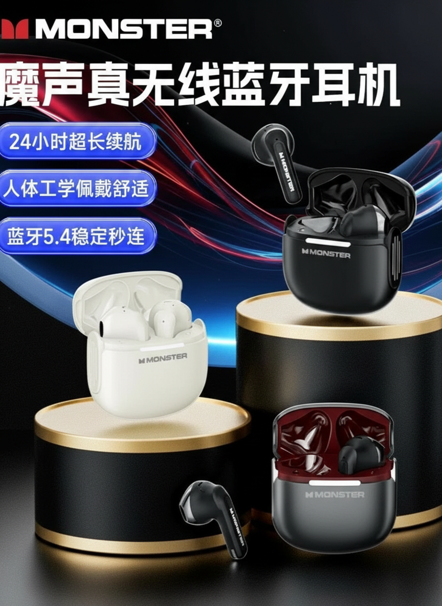 MONSTER True Wireless Bluetooth Earbuds, 24H Playtime, Ergonomic Comfort Fit, Bluetooth 5.4 Stable Connection.