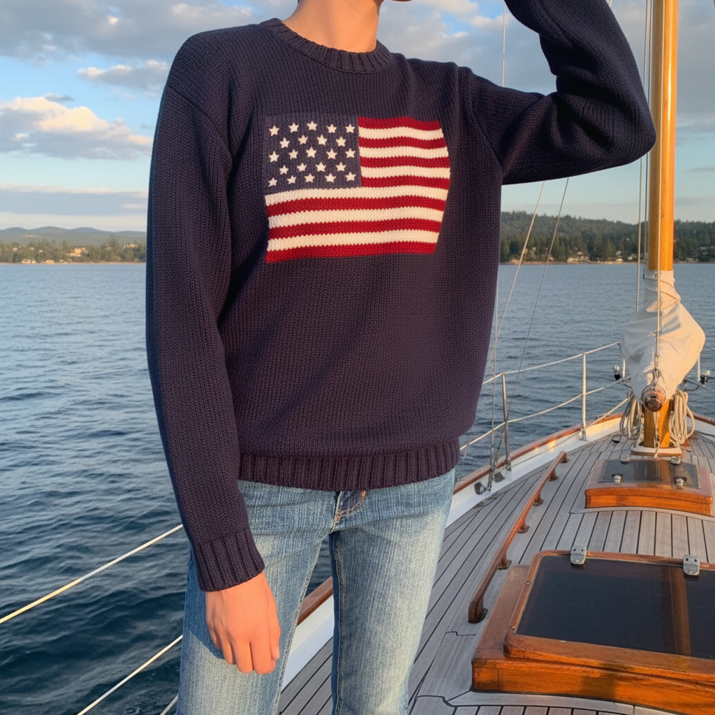 BrandName Navy Knit Sweater with American Flag Design, Casual Patriotic Pullover for Men and Women, Warm Winter Fashion Top