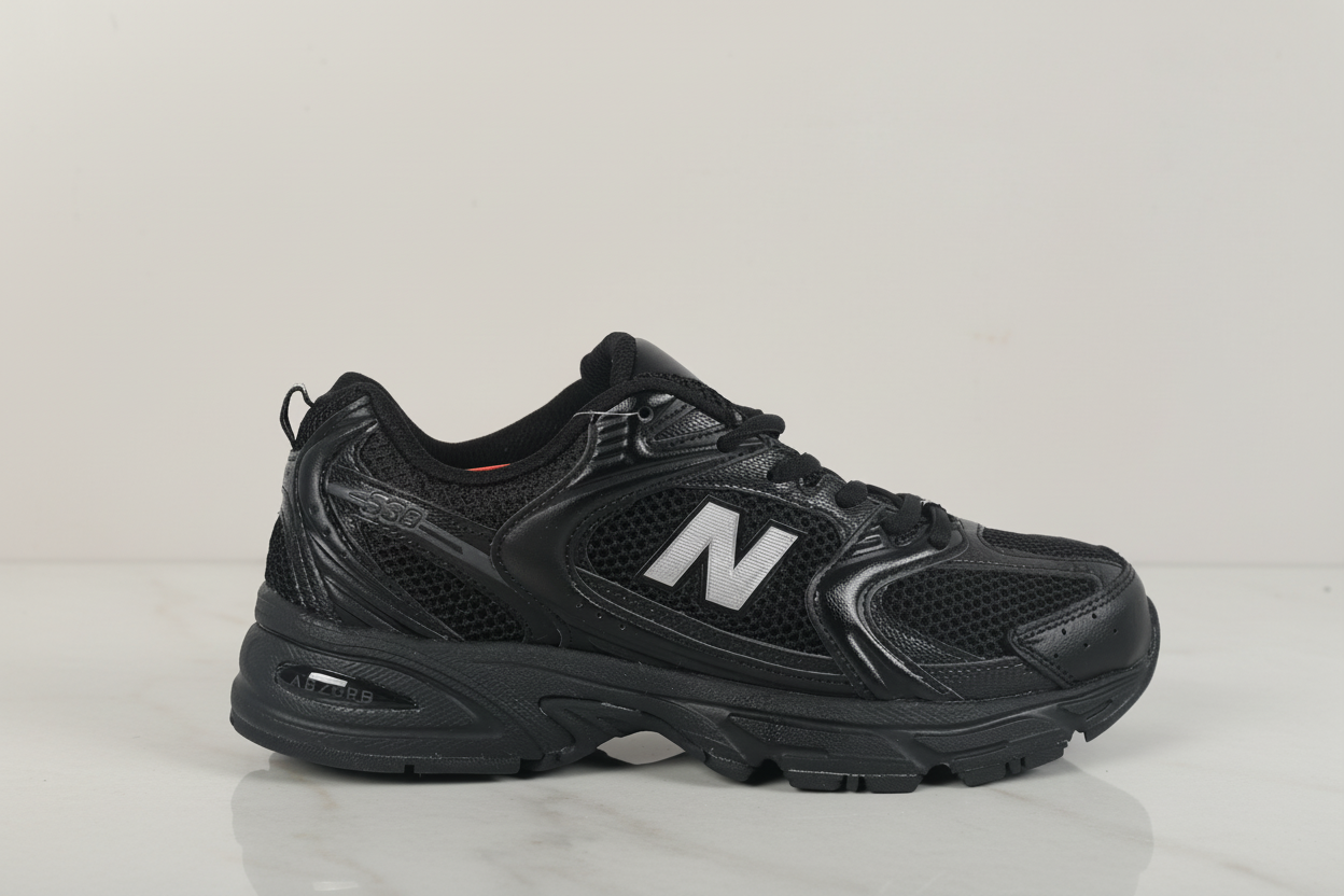 New Balance 530 Black Running Shoes, breathable mesh, cushioned sole, lightweight athletic sneakers for men and women, perfect for sports, walking, and everyday wear.
