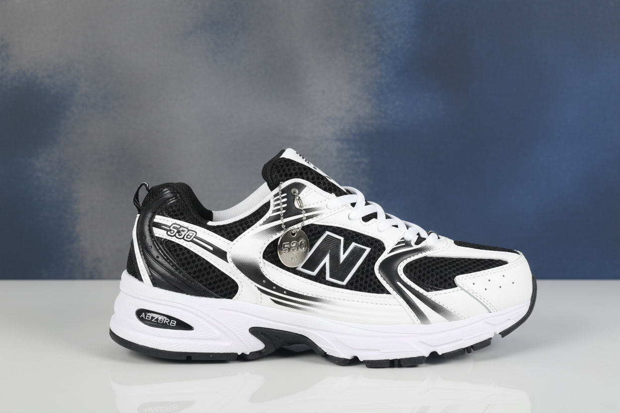 New Balance 530 men’s running shoes, breathable mesh, black and white athletic sneakers with ABZORB cushioning for comfort and performance.