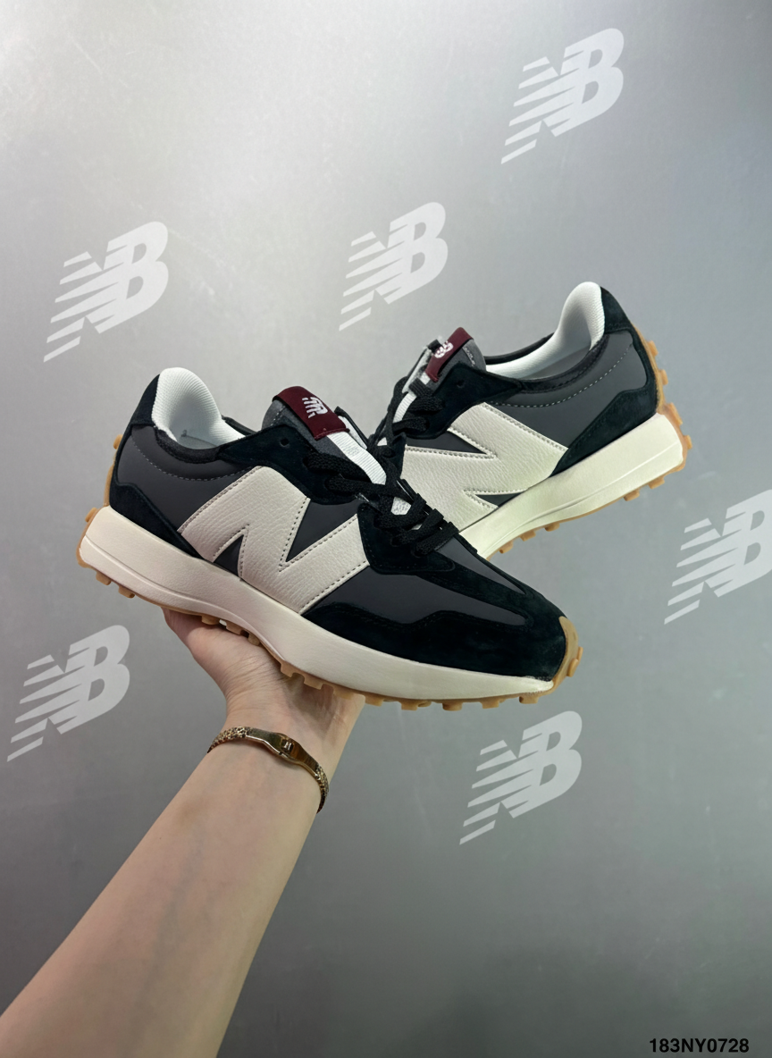 New Balance stylish black and white sneakers with gum sole, perfect for casual wear and sports, offering comfort, durability, and modern design for everyday fashion.