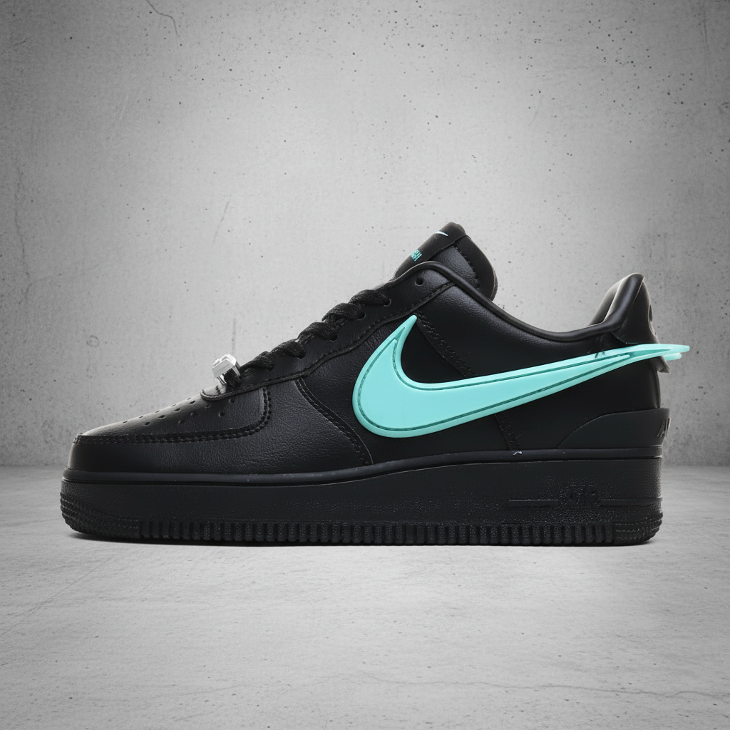 Nike Air Force 1 Low Black Leather Sneakers with Aqua Swoosh, Stylish Casual Sports Shoes for Men and Women, Durable Comfort Footwear