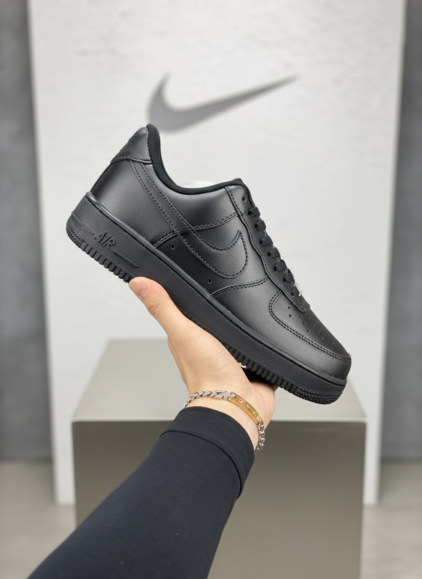 Nike Air Force 1 Black Leather Sneakers, classic low-top design, durable sole, stylish and comfortable for everyday wear and sports.