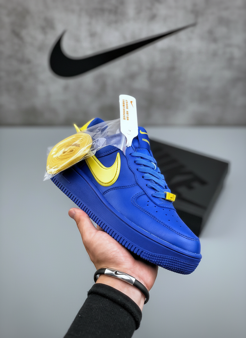 Nike Air Force 1 Low Blue Yellow Sneakers, premium leather, classic design, durable sole, extra yellow laces, perfect for casual wear and street style fashion.