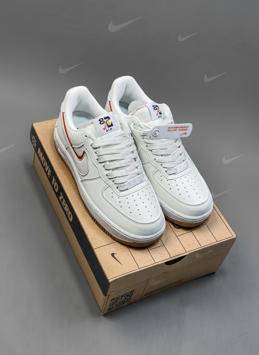 Nike Air Force 1 White Sneakers, classic low-top design with red Swoosh, durable leather upper, comfortable fit, sizes 36-40.5, perfect for casual and streetwear style.