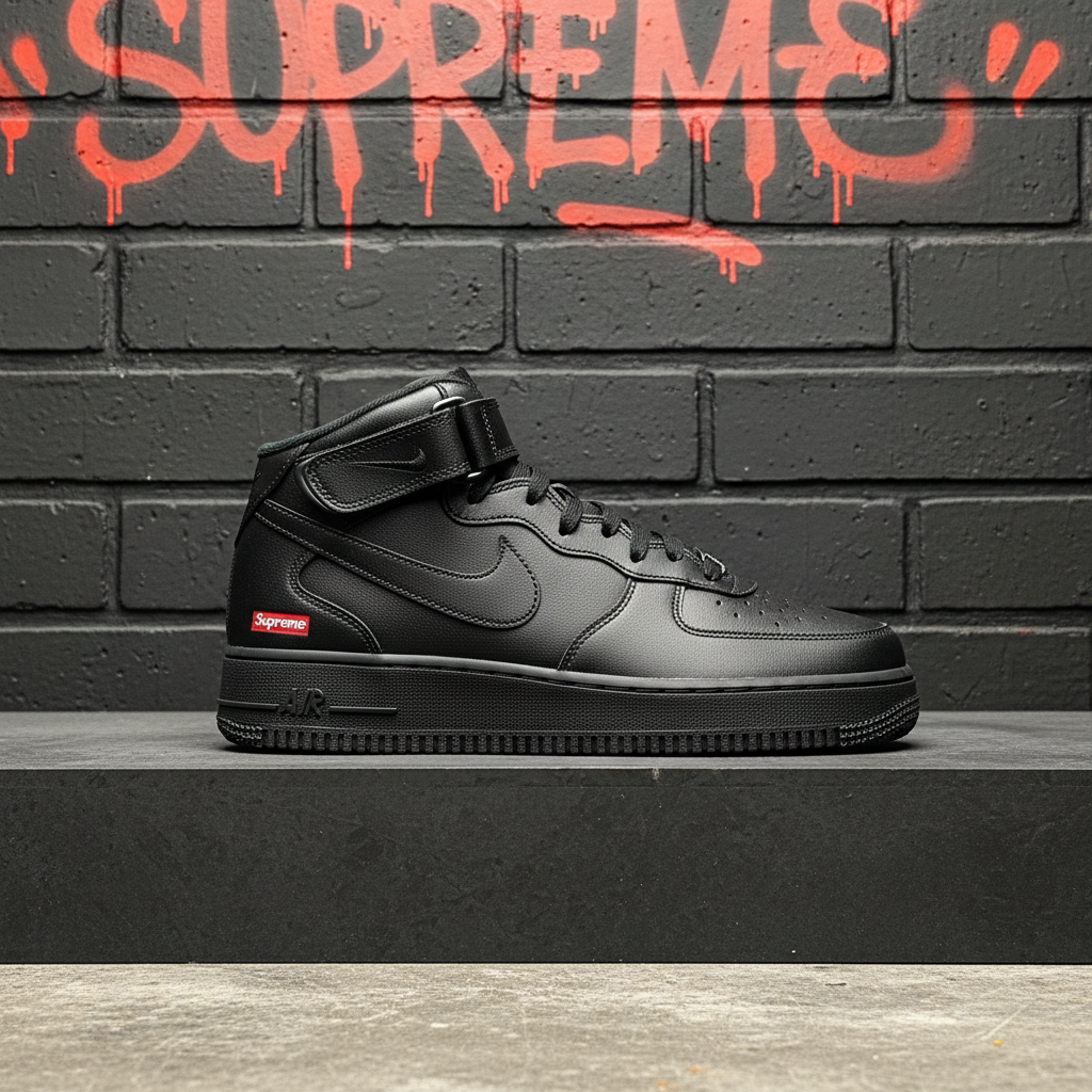 Nike Supreme Air Force 1 Mid Black Leather Sneakers, stylish high-top design with iconic branding, durable sole, and premium comfort for everyday wear.