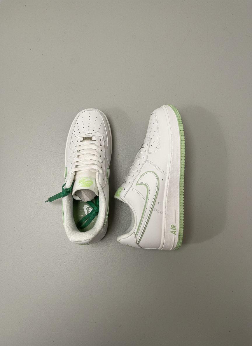 Nike Air Force 1 white sneakers with green accents, classic low-top design, premium leather, durable sole, perfect for casual style and everyday comfort.