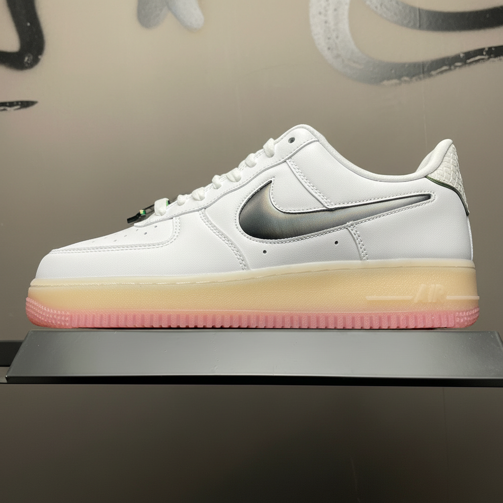 Nike Air Force 1 Low White Leather Sneakers with Gradient Swoosh, Beige Midsole and Pink Outsole, Casual Sports Shoes for Men and Women