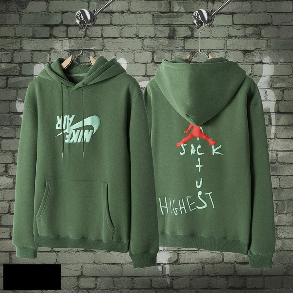 Nike Air green hoodie with front logo and back “Jack Cactus Highest” graphic, soft fleece fabric, casual streetwear style for men and women.