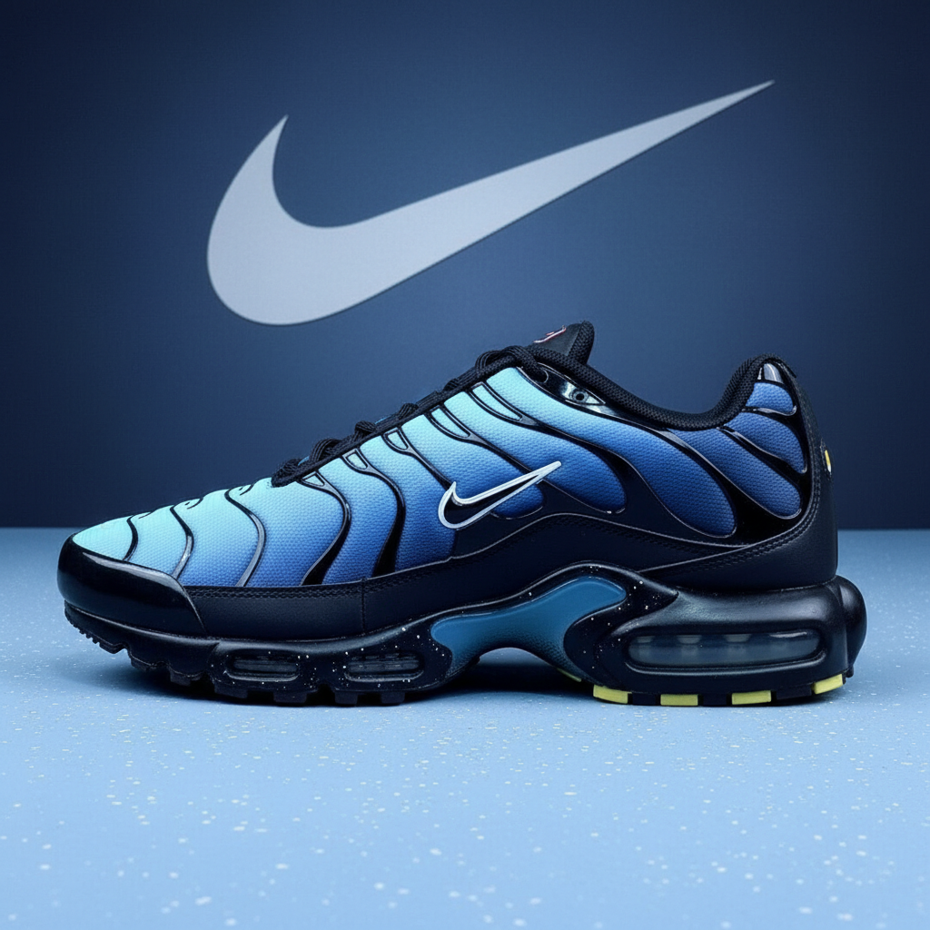Nike Air Max Plus sneakers in gradient blue and black, featuring Tuned Air cushioning, breathable mesh upper, and durable rubber sole for comfort and style in sports and casual wear.