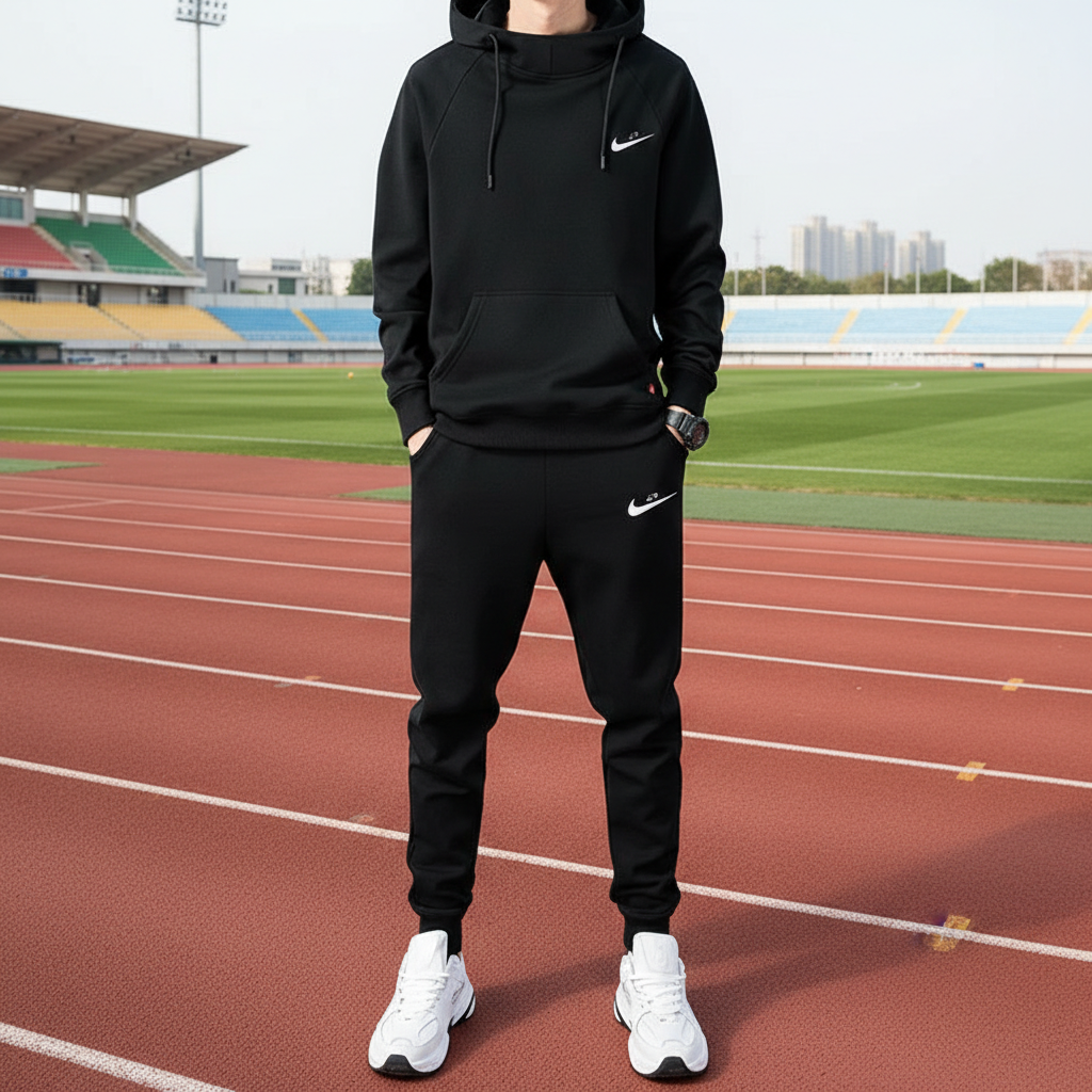 Nike Men’s Black Hoodie and Sweatpants Set, casual sportswear with iconic logo, comfortable fit for workouts, streetwear, and everyday style.